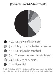 These results are surprisingly similar to the effectiveness of conventional medicine. A study printed in 2015 in the British Medical Journal (BMJ) found that of 3,000 commonly used NHS treatments 50% are of unknown effectiveness and only 11% are proven to be beneficial.
